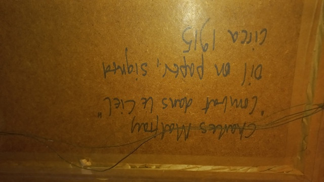 The painting depicts an aerial combat scene, likely inspired by World War I, which aligns with the stated date of 1915. This subject matter would have been timely and relevant during the period, potentially adding historical significance. The inscription on the back, "Combat dans le ciel" (French for "Battle in the Sky"), reinforces the theme and possibly indicates the original title.