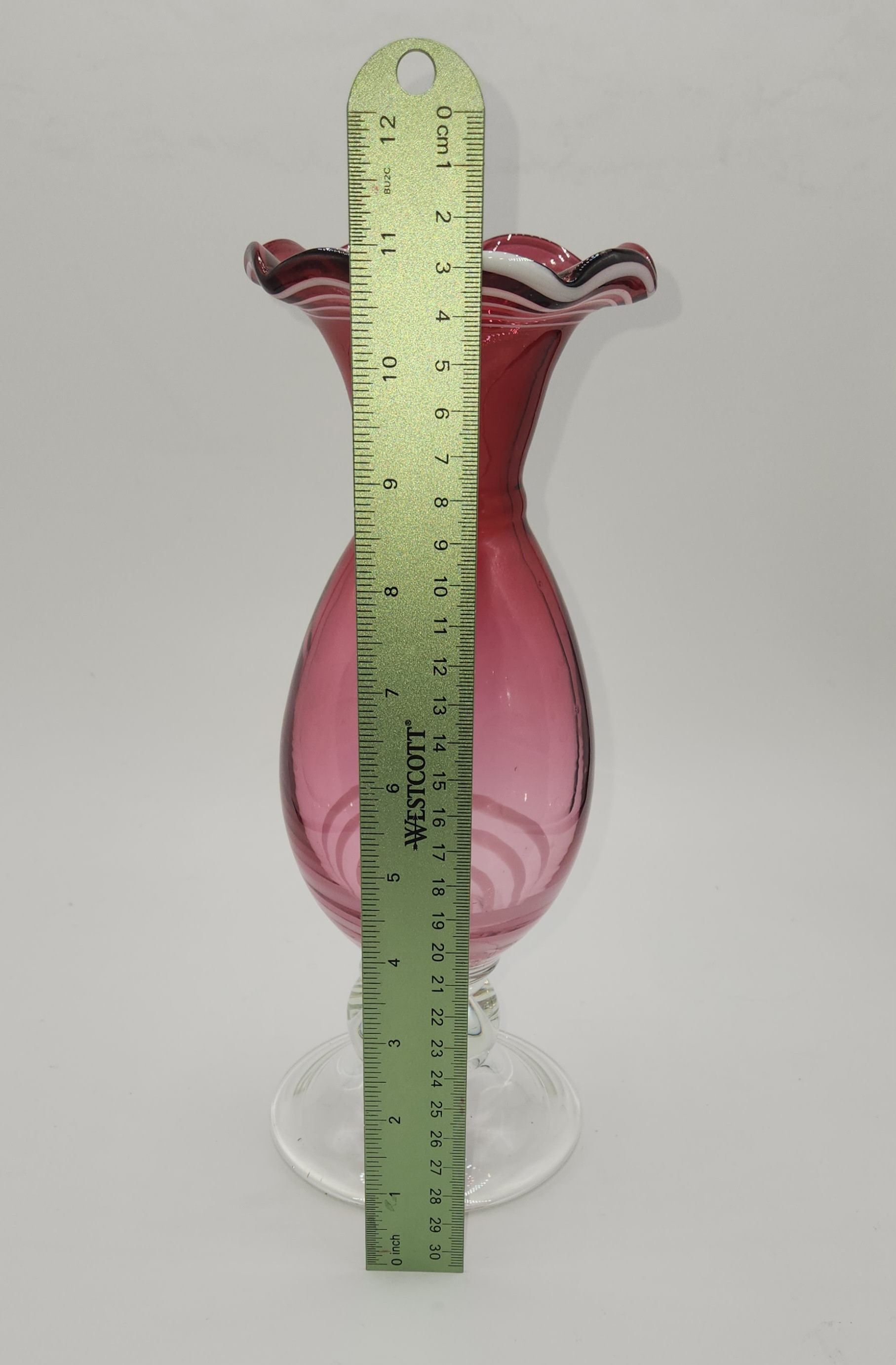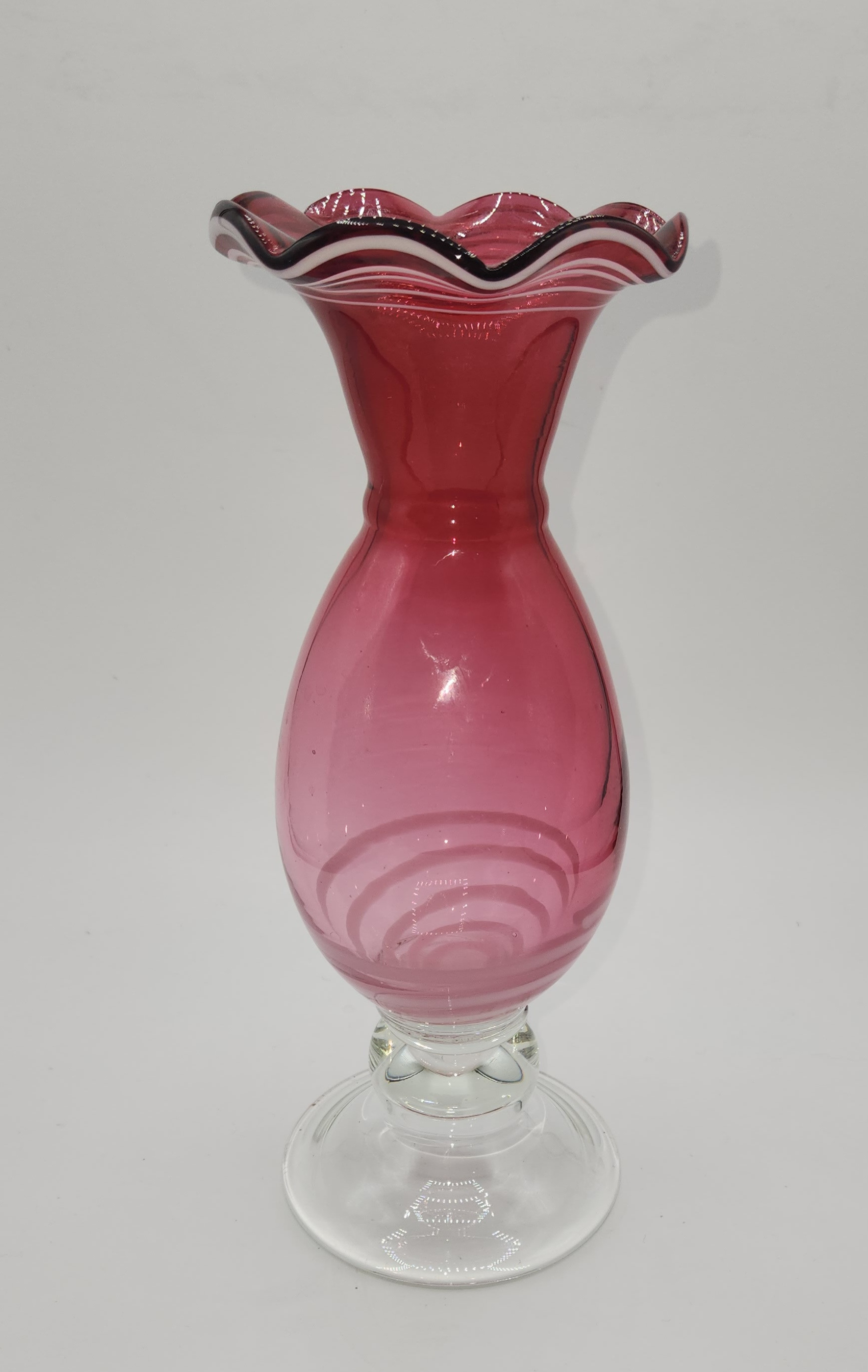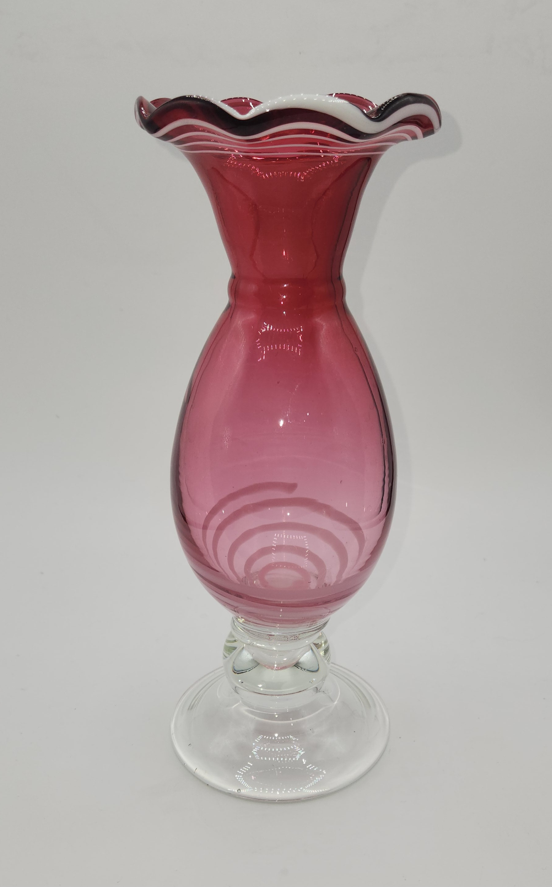 Cranberry glass vase - may be Fenton. White swirls at bottom of vase. Top edge is fluted and has white and black swirls.