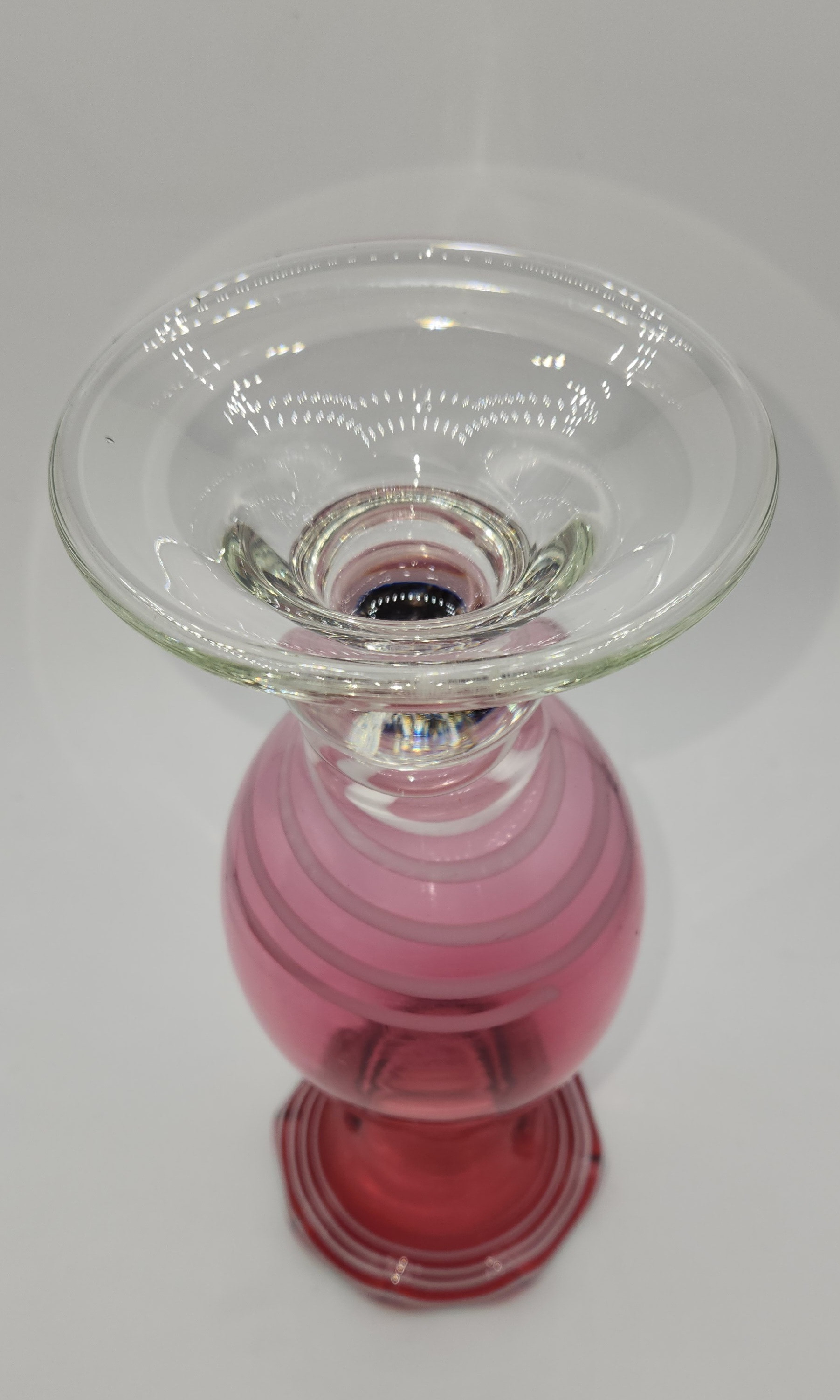 Please examine your vase for a sign of pontil mark where the clear meets the cranberry, Fenton pieces will not have pontil "dimple" marking.