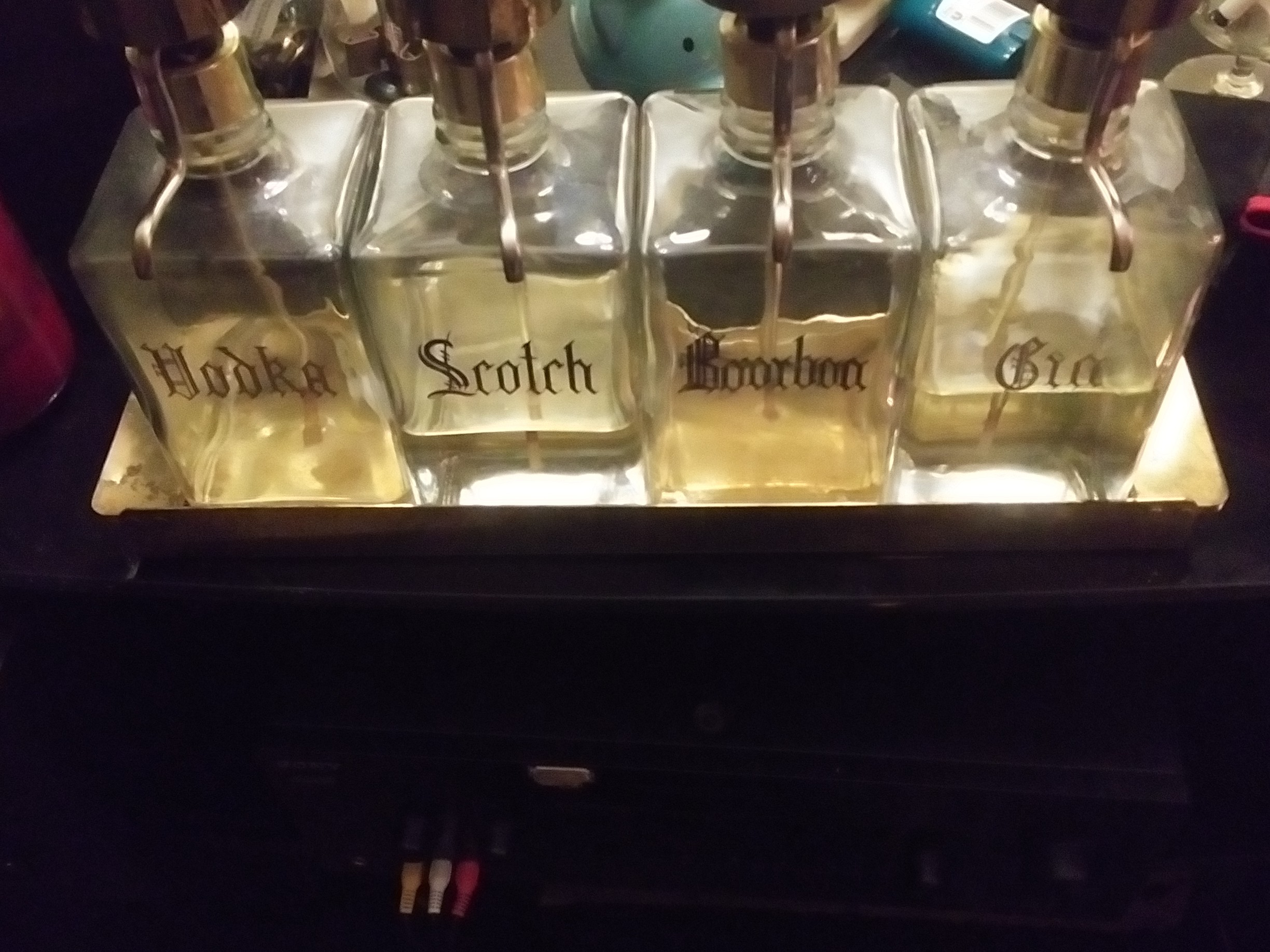 Set of four glass decanters with pump tops. Each pump dispenses approximately 2oz (60ml) Each is etched with the intended contents: Bourbon Brandy Gin Vodka All sit in a brass tray. The pump tops are also brass as well as a brass sleeve around each bottle neck. The brass tray is imprinted with a hallmark: "Brøndberg & Tandrup A/S Denmark" that circles the initials BT The tray has some moderate moisture damage and some scratches on the bottom. A previous owner tried to put tape on the bottom to prevent further damage The glass is clean and free of chips, dings or cracks. In my own research, I have only found one other instance of this decanter set. I found a set with the same concept, but it was 3 decanters, stainless steel tops and acrylic try for $395. Category: Glass Condition: Good Medium: Glass/Brass Distinguishing marks: Stamped Hallmark on the bottom of the tray. I t is a circle that has Brøndberg & Tandrup A/S Denmark around the circumference. In the center, it says BT. Size and dimensions of this item: Decanters are 3.5" x 3.5" x 11" Hold pprox 32oz (480ml) Pump dispenses approx 2oz (60ml) per pump Tray is 17.25" x 3.75" x 1.25" Weight: Decanters are approx 2lbs (4.4kg) each Tray is approx 2.5lbs (3.3kg) Total weight is 10.5lbs (13.3kg) History:unknown but is for sale
