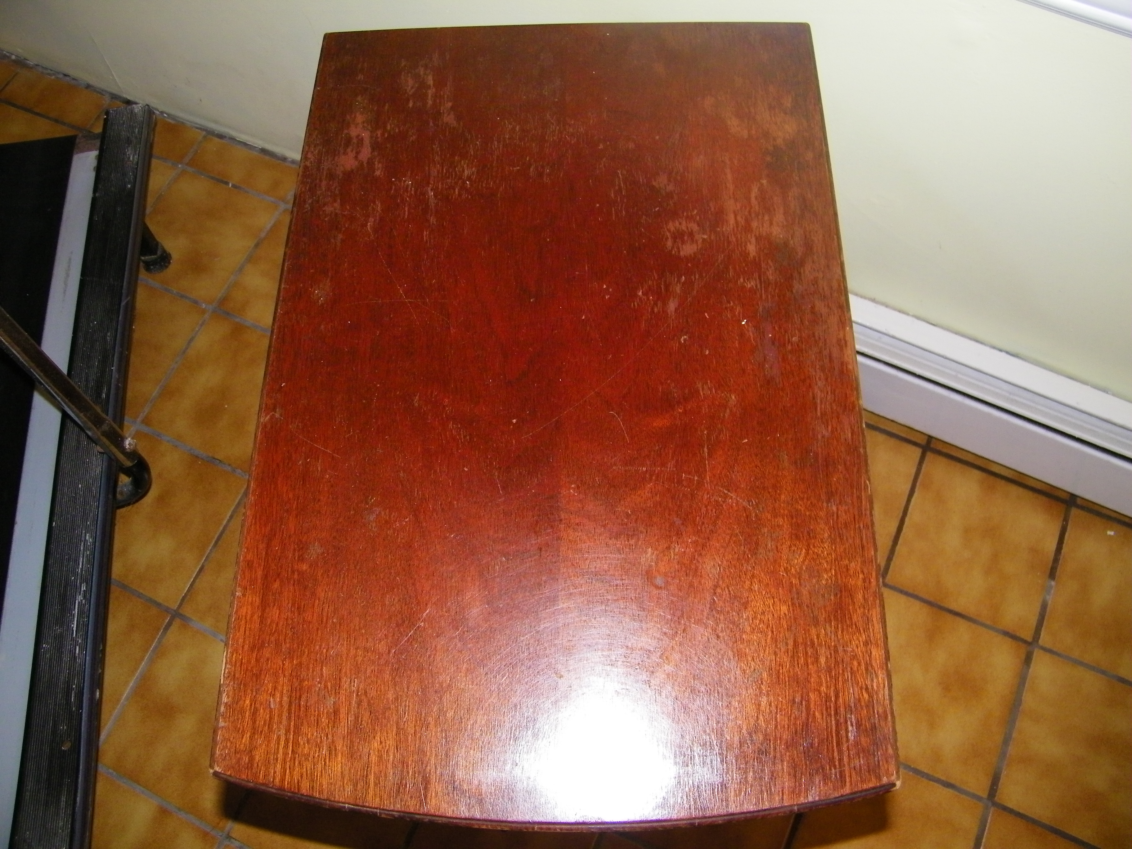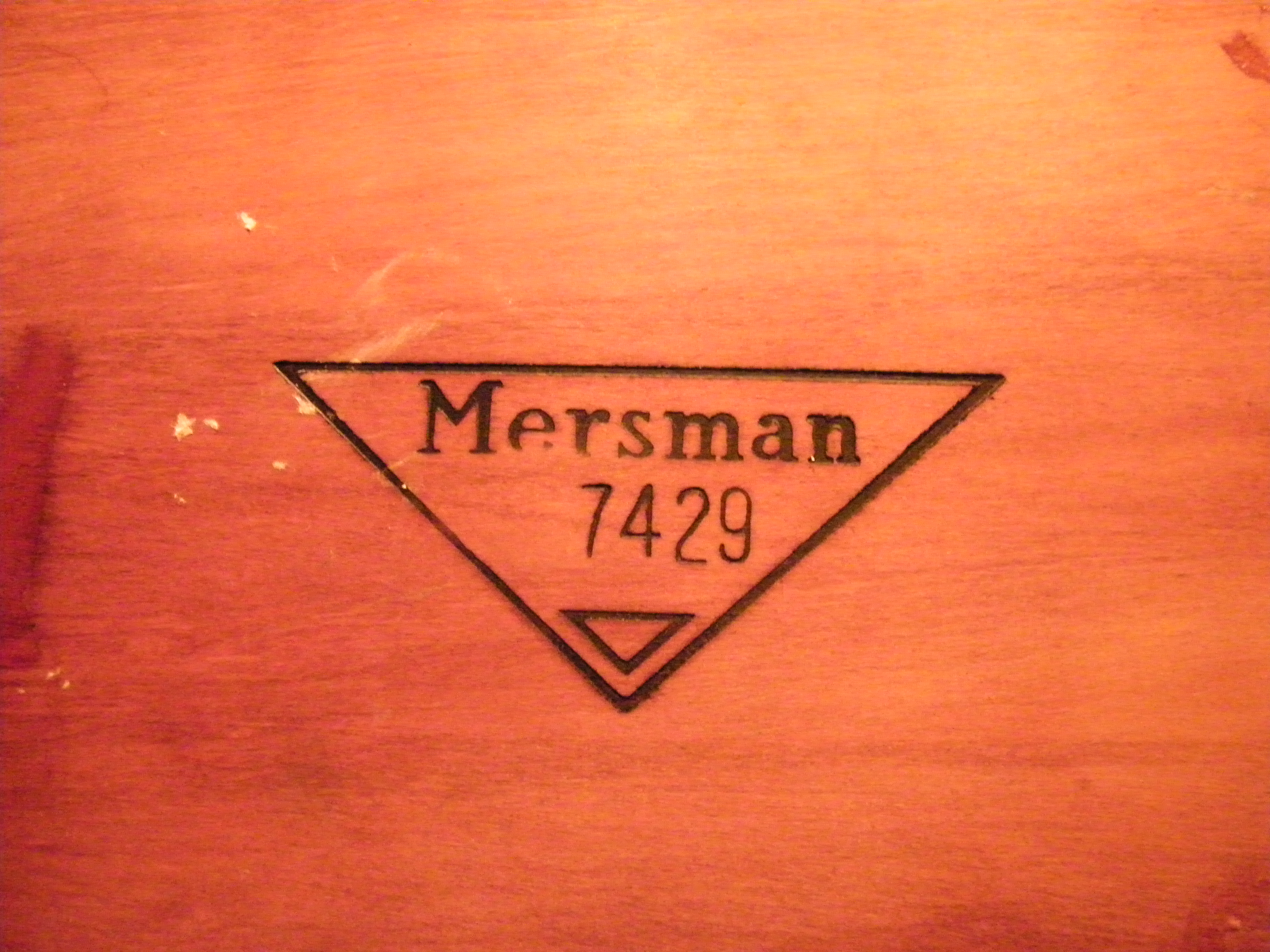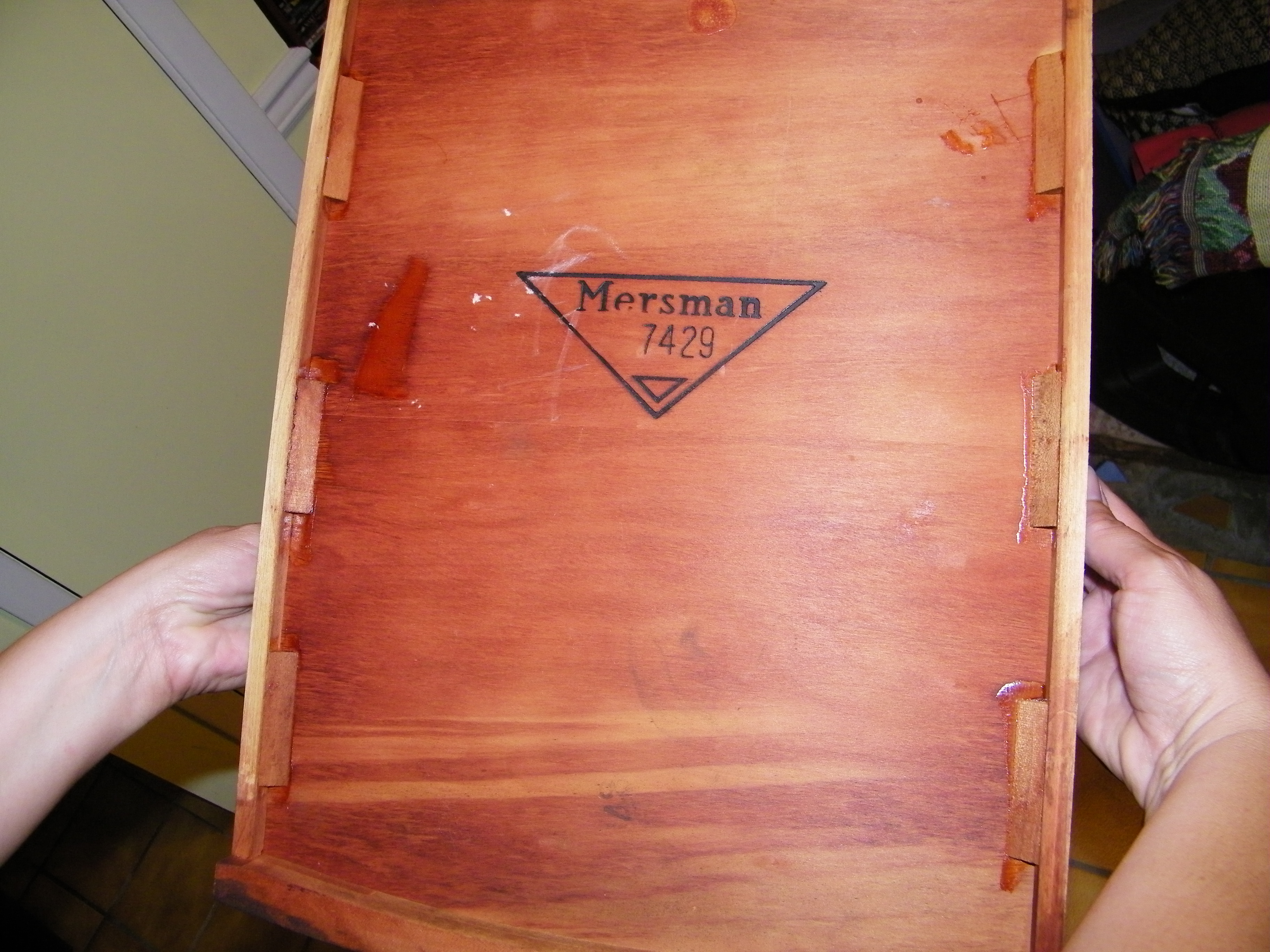 This is an antique mahogany two drawer tongue and groove Mersman table or end table. Table is physically sturdy. Two drawers open and close. Because of its age it is not in new condition, it has its worn issues and scratches, especially the top. It has no broken pieces or major dings. Bottom of drawer reads 'Mersman 7429'.