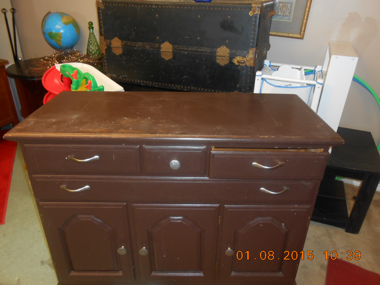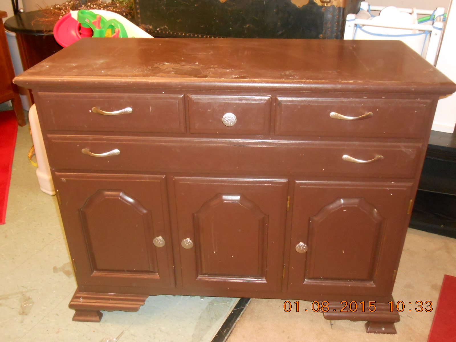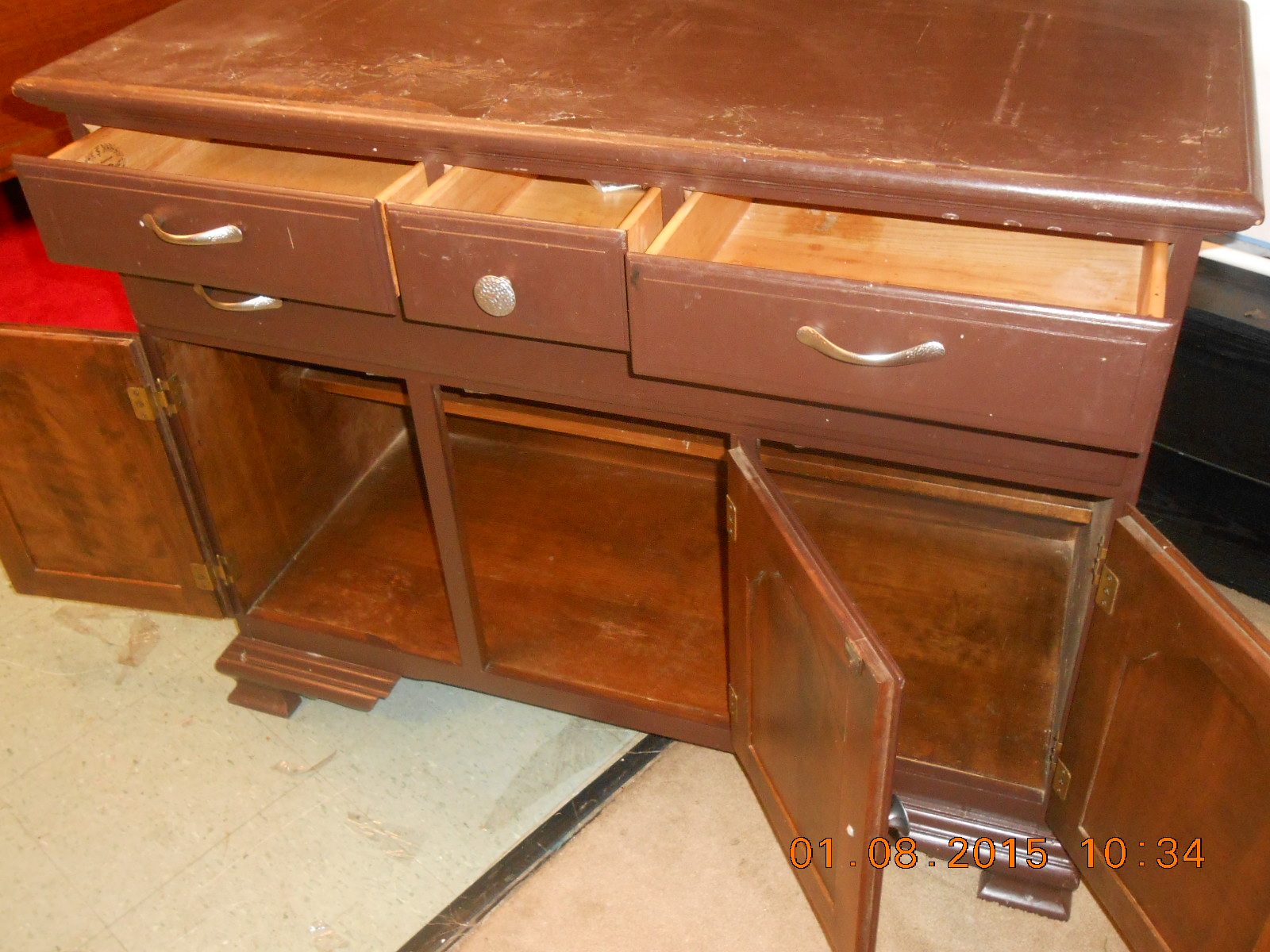 Very strong and solid piece. Not sure of the proper name but I think it may be a buffet. I found it in a storage locker and have no idea of its value. Needs refinished. The first pic is the actual color. The angle of the camera is why the color differs. Could someone please tell me what it is worth.