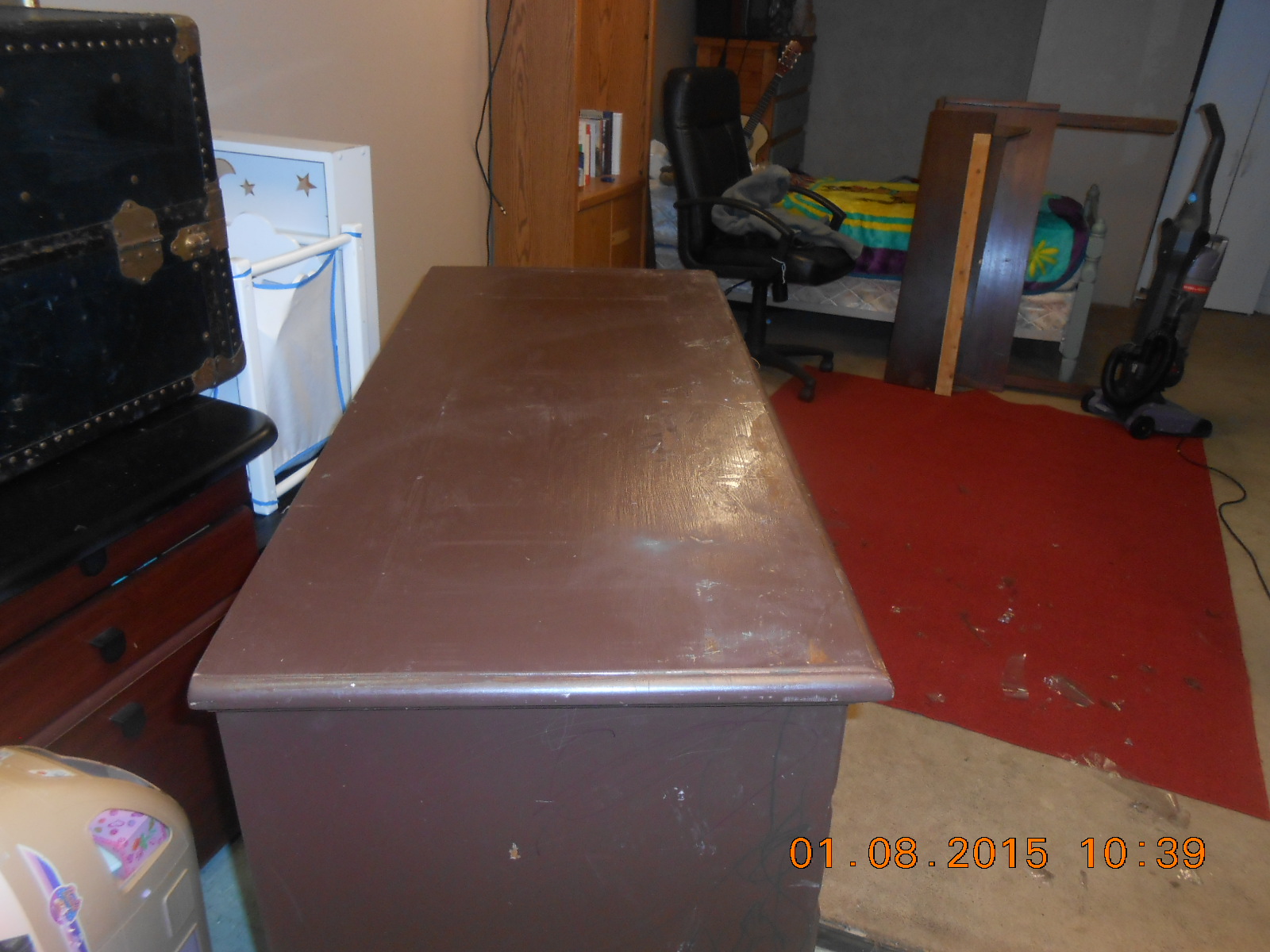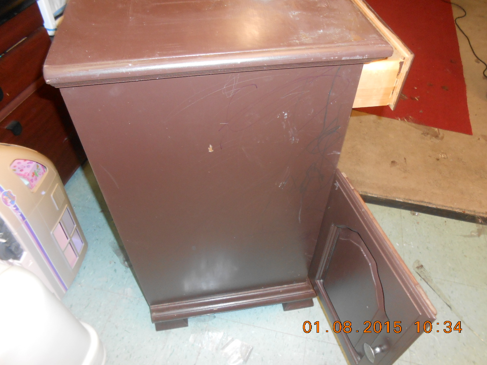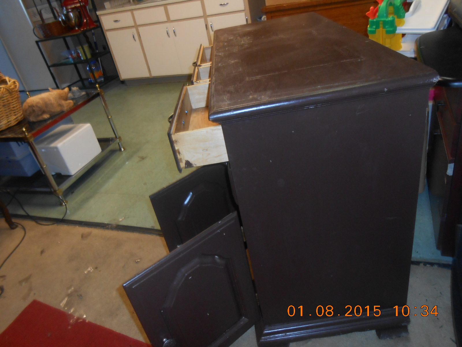 Very strong and solid piece. Not sure of the proper name but I think it may be a buffet. I found it in a storage locker and have no idea of its value. Needs refinished. The first pic is the actual color. The angle of the camera is why the color differs. Could someone please tell me what it is worth.