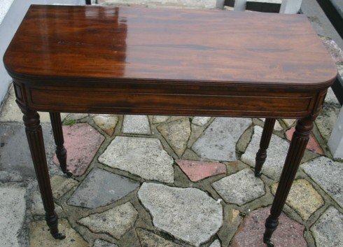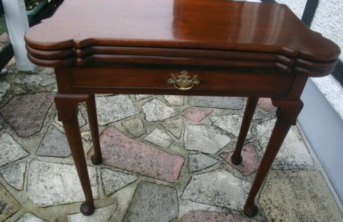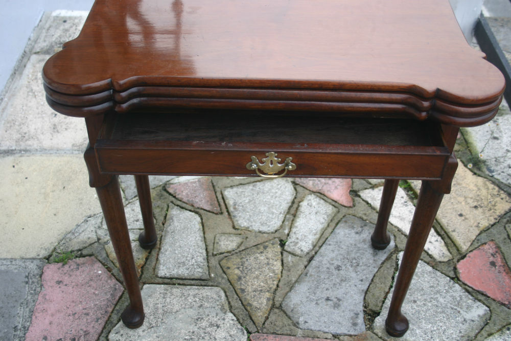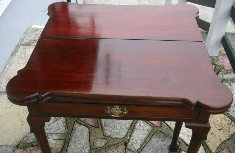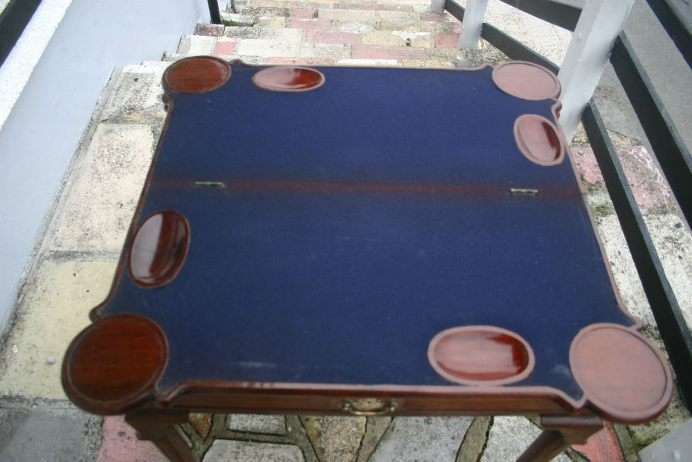we have a georgian triple folding card table this is also a tea table very unusual table the card table is upholstered in blue with scoops for your counters the wood is mahogony in good condition