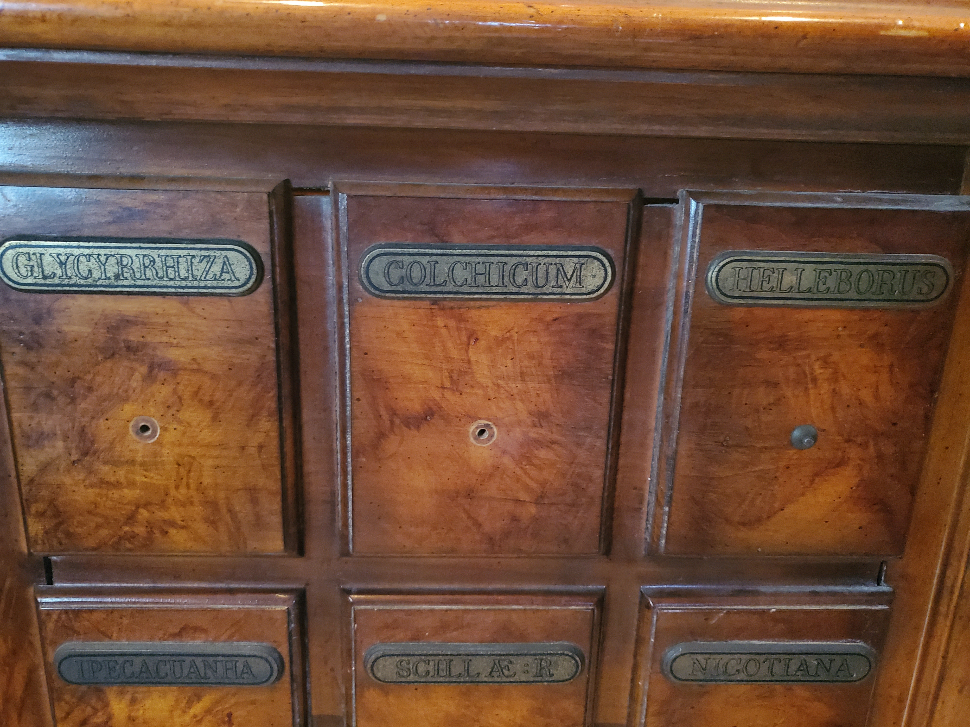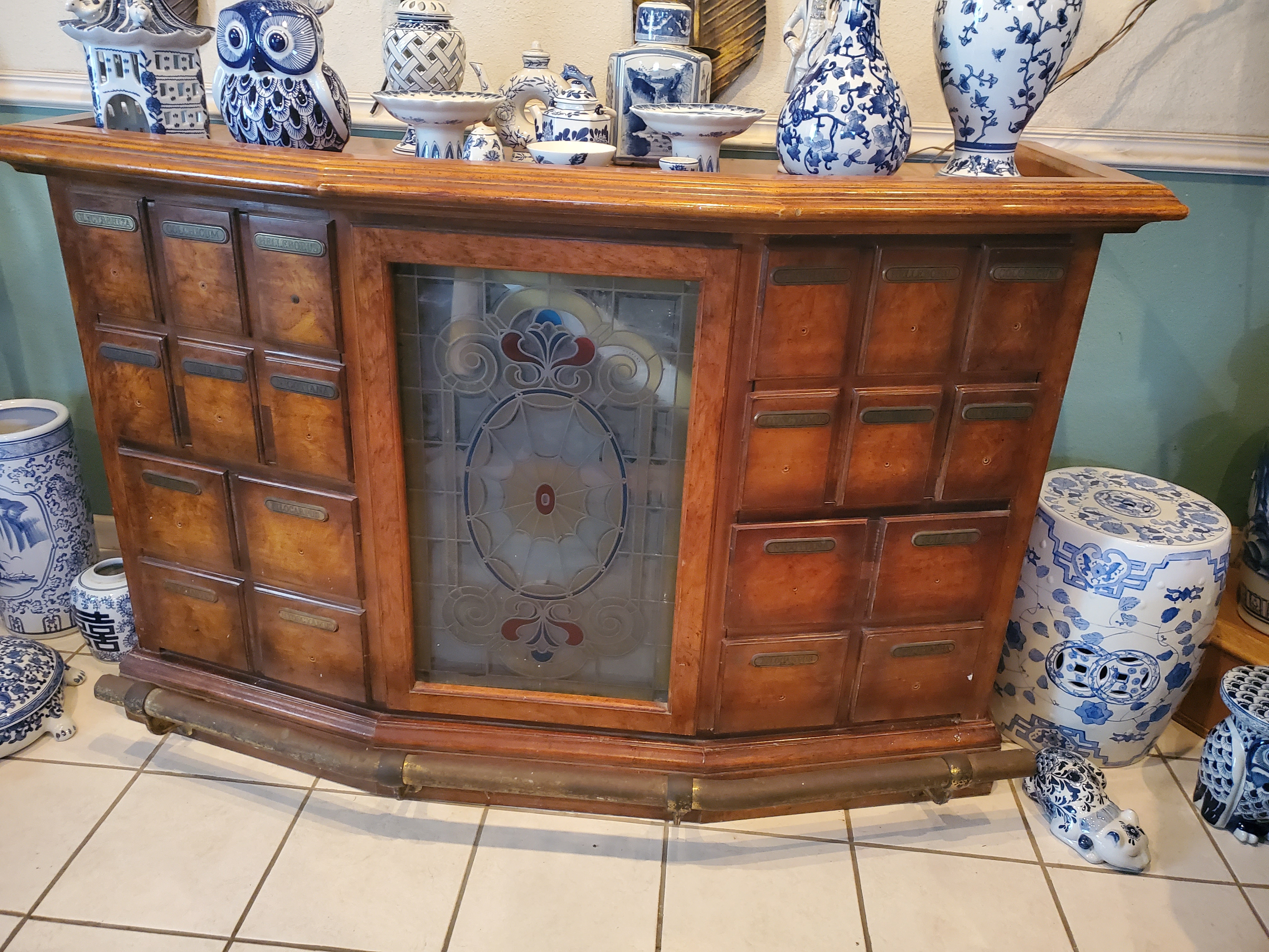 German bar two shelfs in back with a light two doors on each side appear to have tiffany glass in Middle on front good condition on front bar each square is a name of a flower in german words