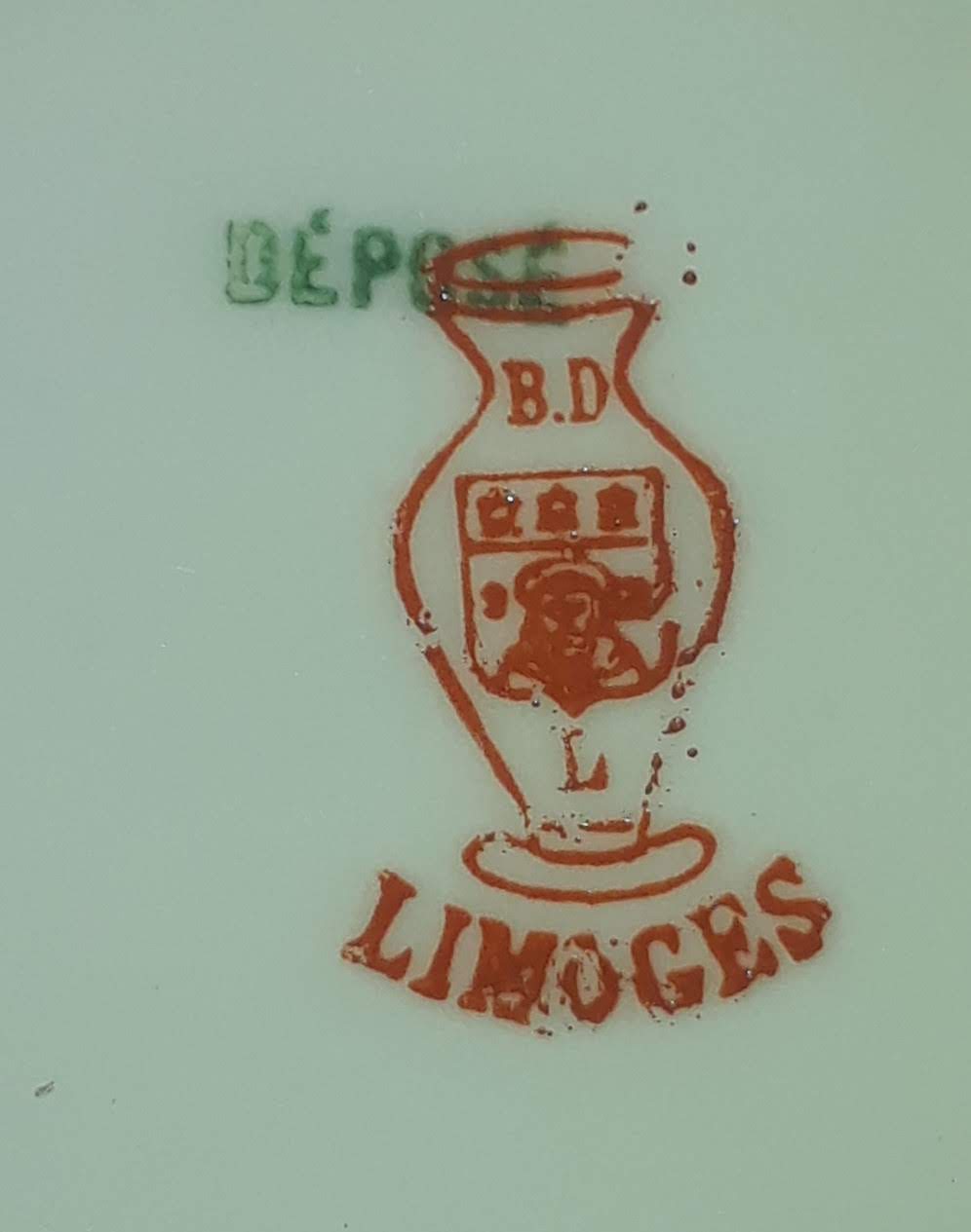 Mark on bottom of tea cup has a picture of a Red vase with a person face and letters B D L .
