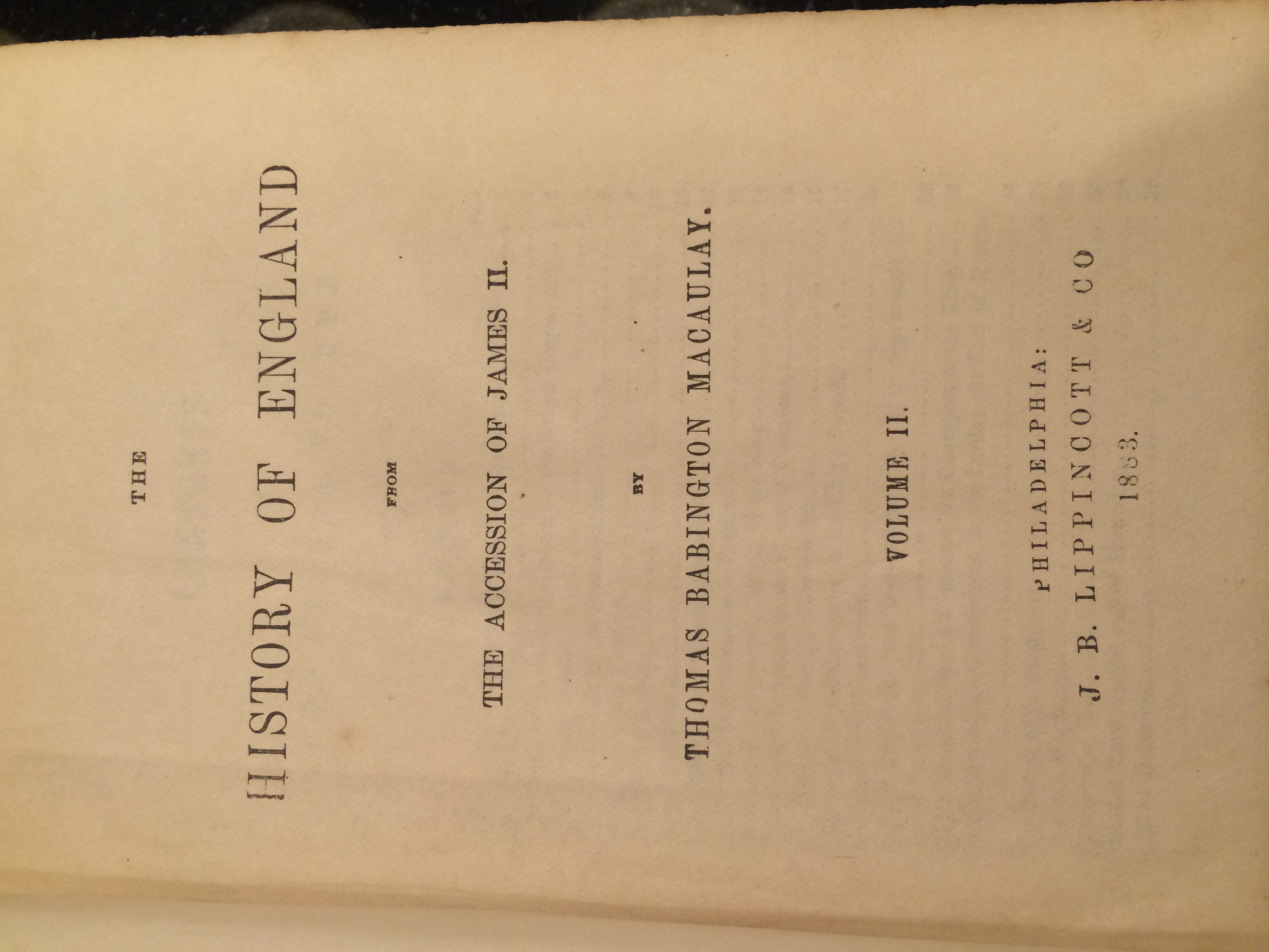 I have a set of Volume's I, II, and III of Macaulay's England that are dated 1881. The set is in mint condition and has been in the family since 1944. The author is Thomas Babington Macaulay. I do not know much more about the books content and value. I will attach photos a.s.a.p.