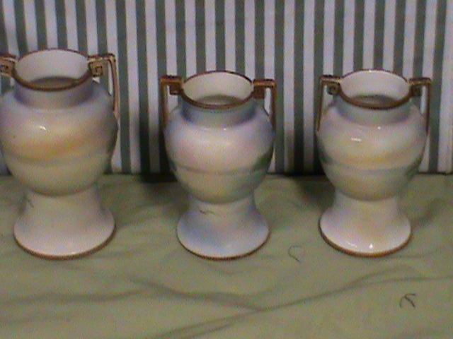 There are three vases. Two are the same height, and one is slightly taller. The smaller one is