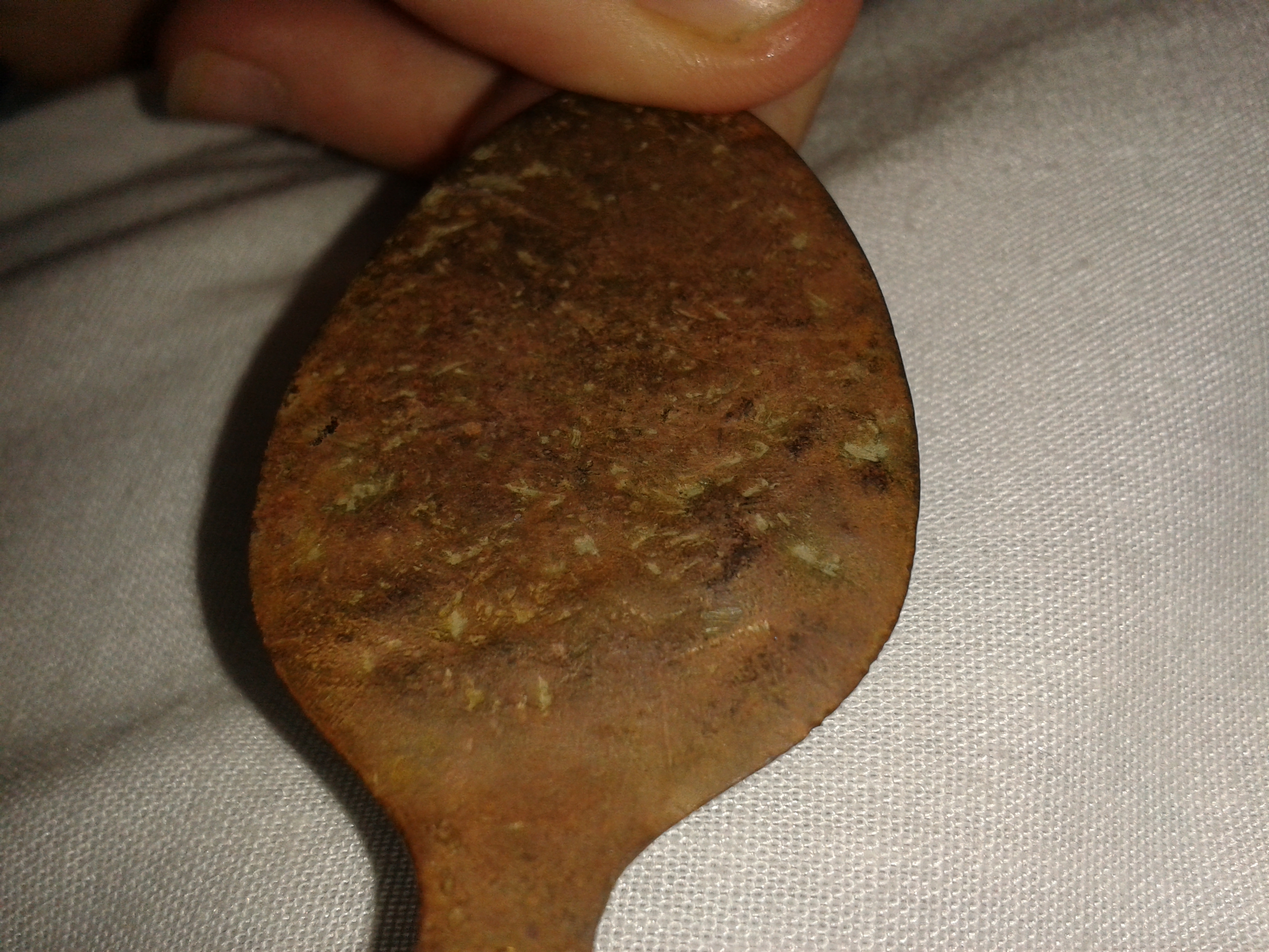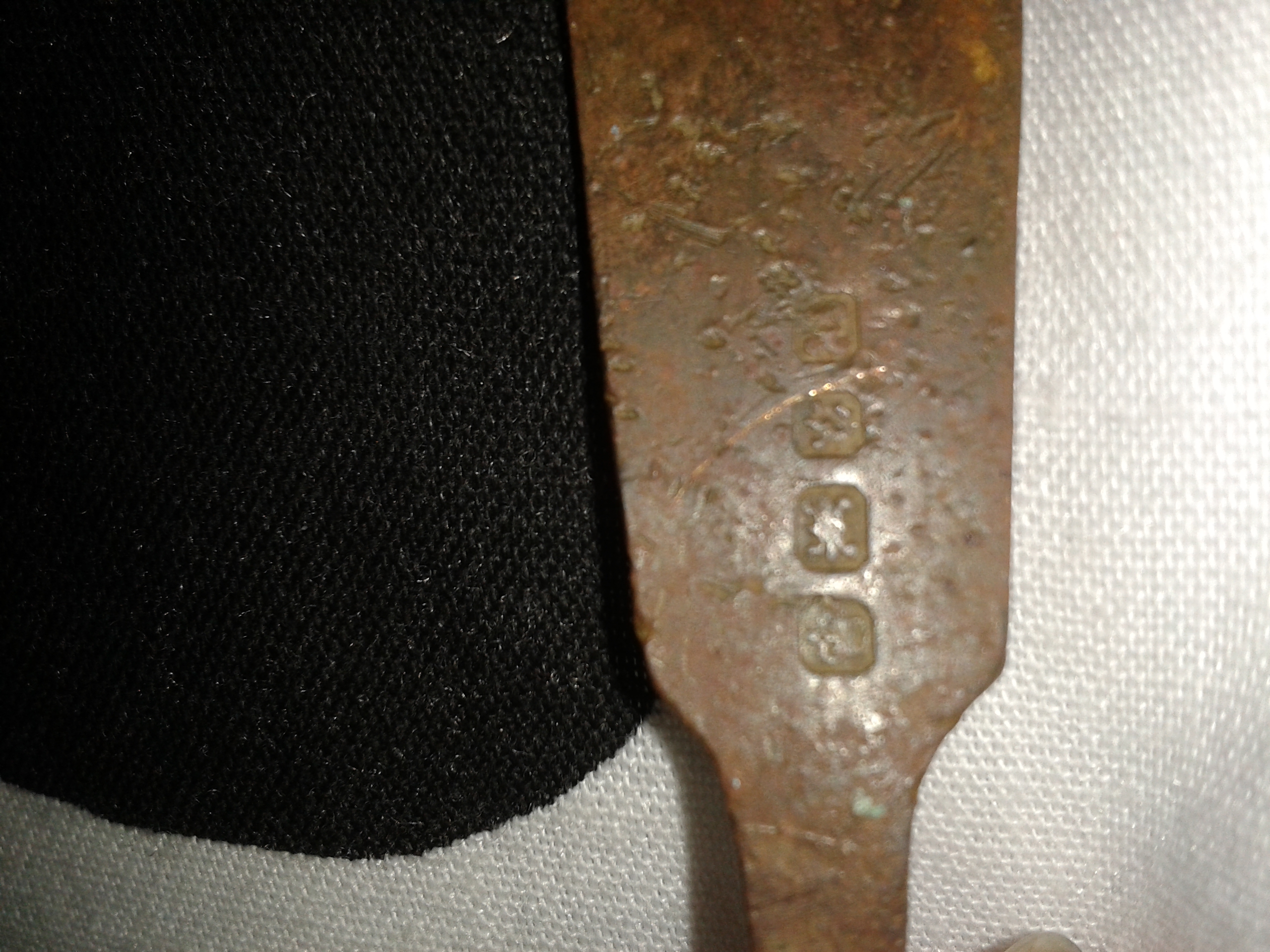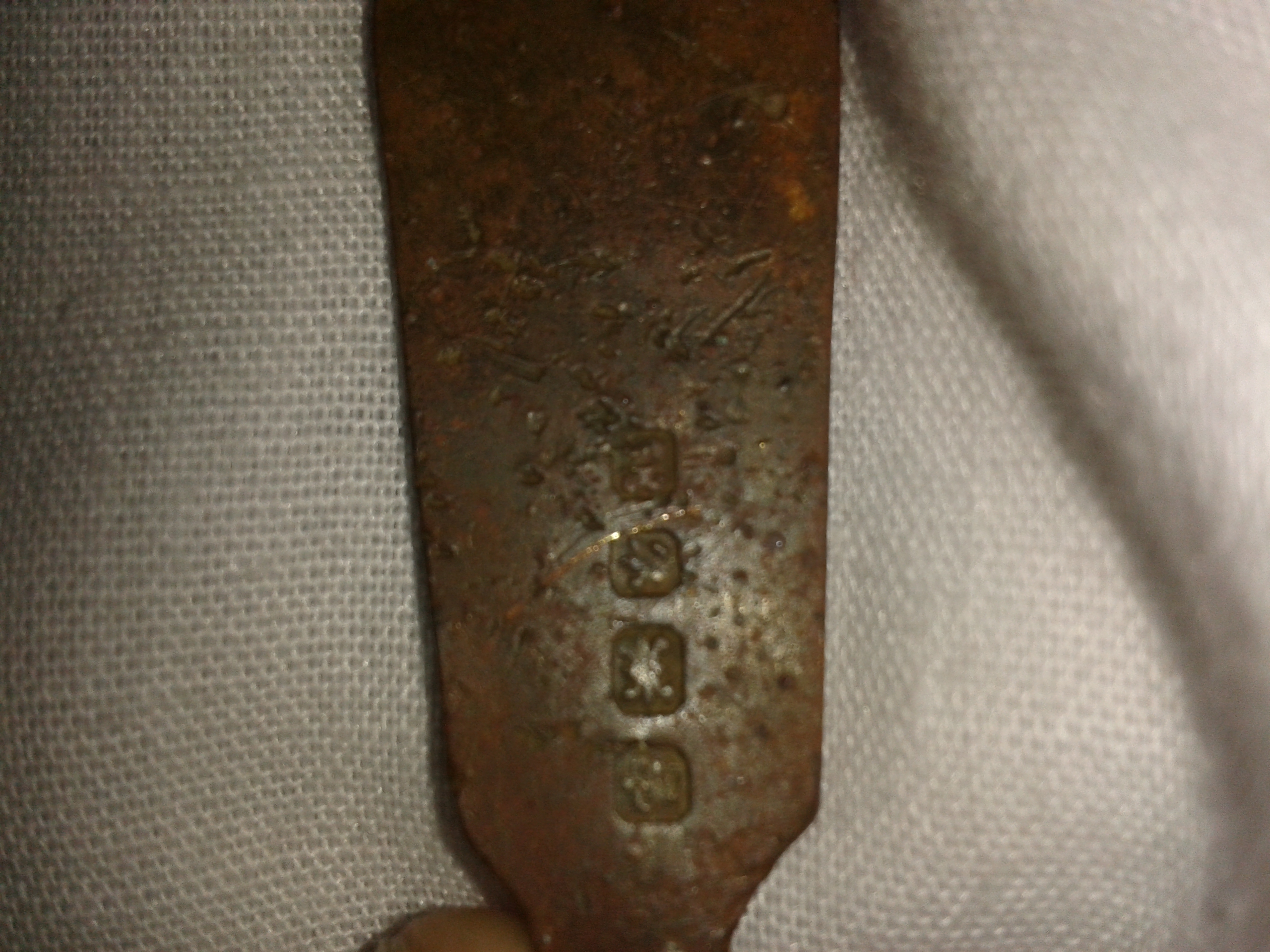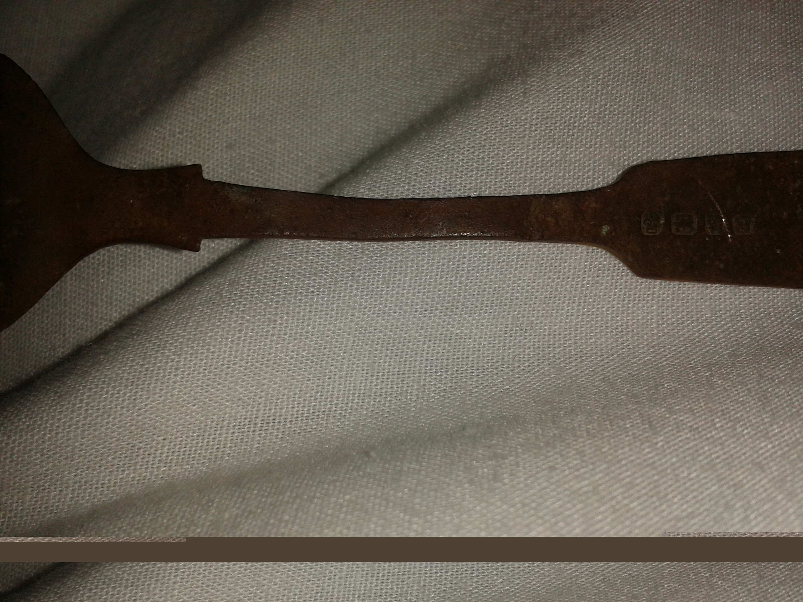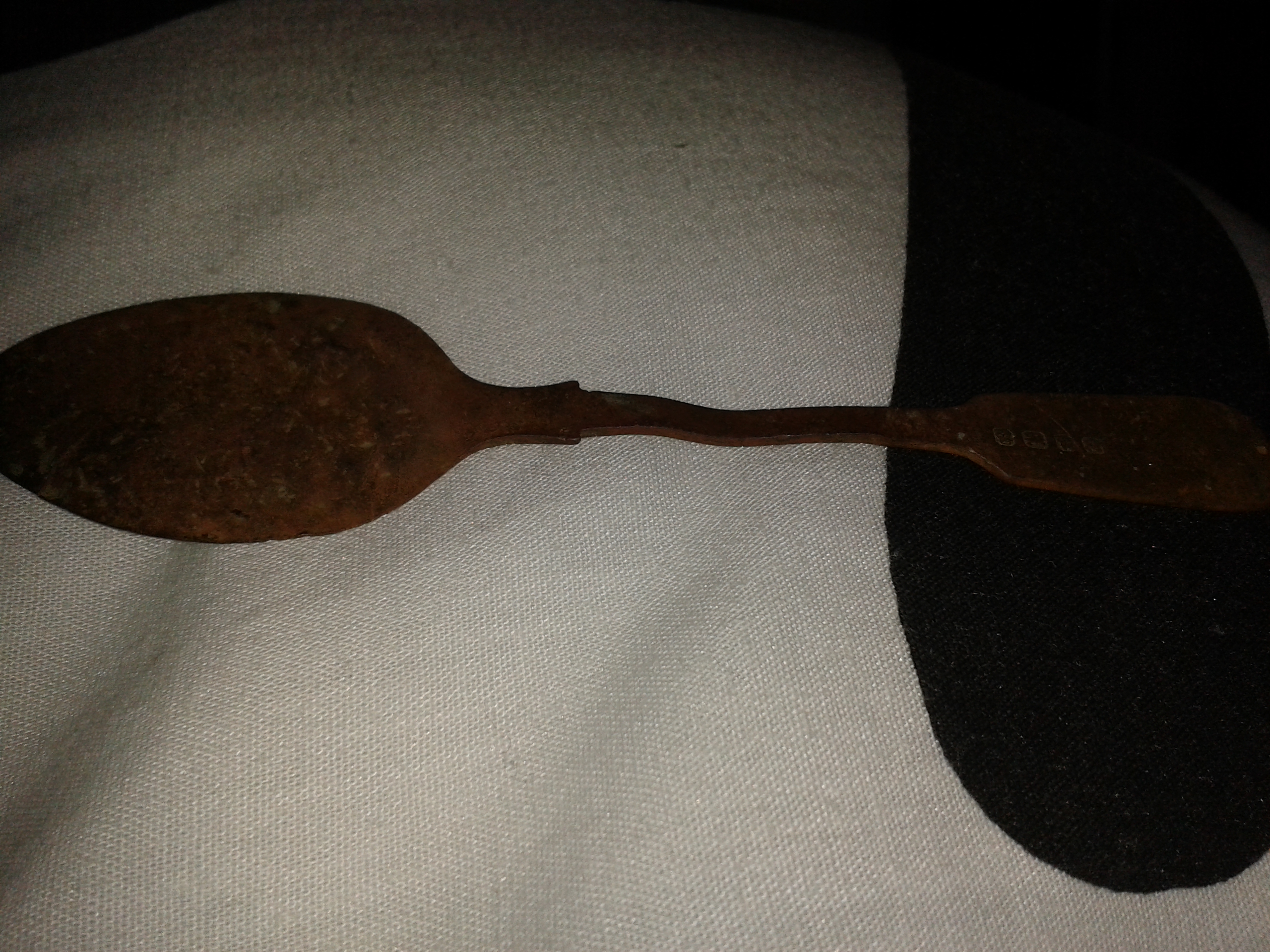Belived to be silver. Vompletly flat head od the spoon. Cerved handle. 4 picture hall matk first two a crown and crab.