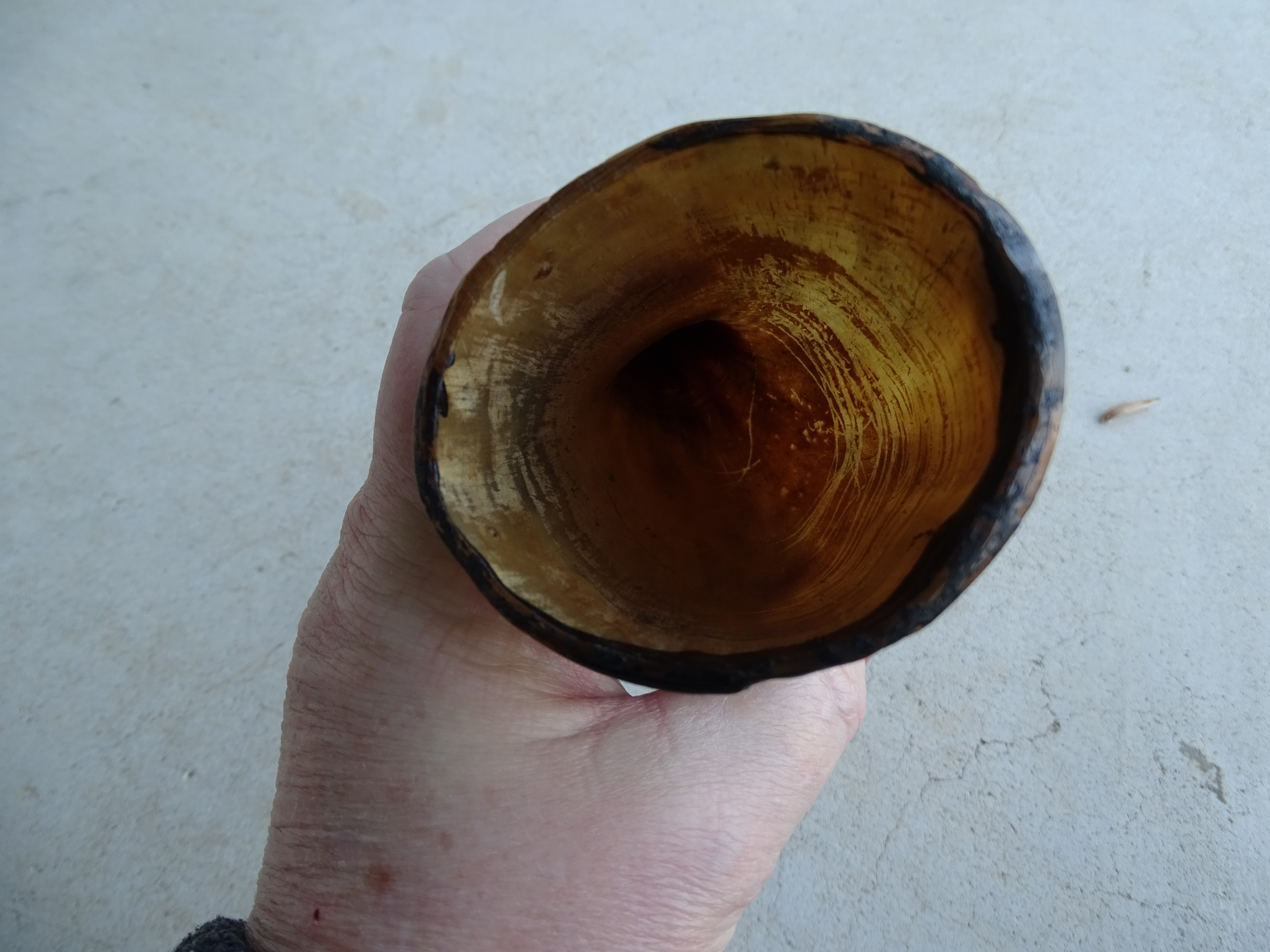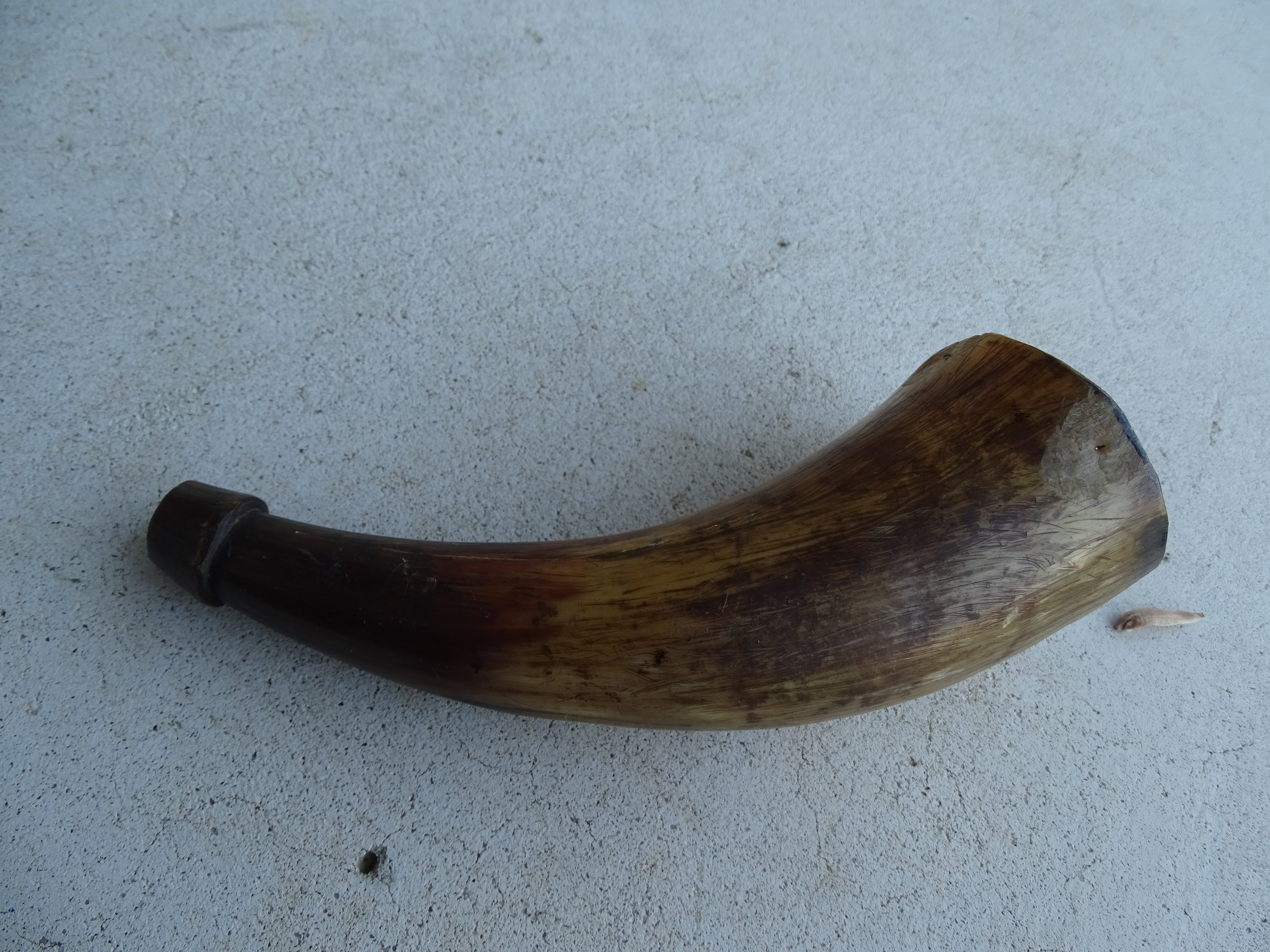 Looks like a powder horn, used when adding gun powder to a muzzle loaded gun. Some parts may be missing. These were usually made from aminal horns such as cows. Could also be a dog horn. Hunters made horns to call their dogs back. If you blow really hard (trumpet style) into the smaller end it may produce a loud sound.