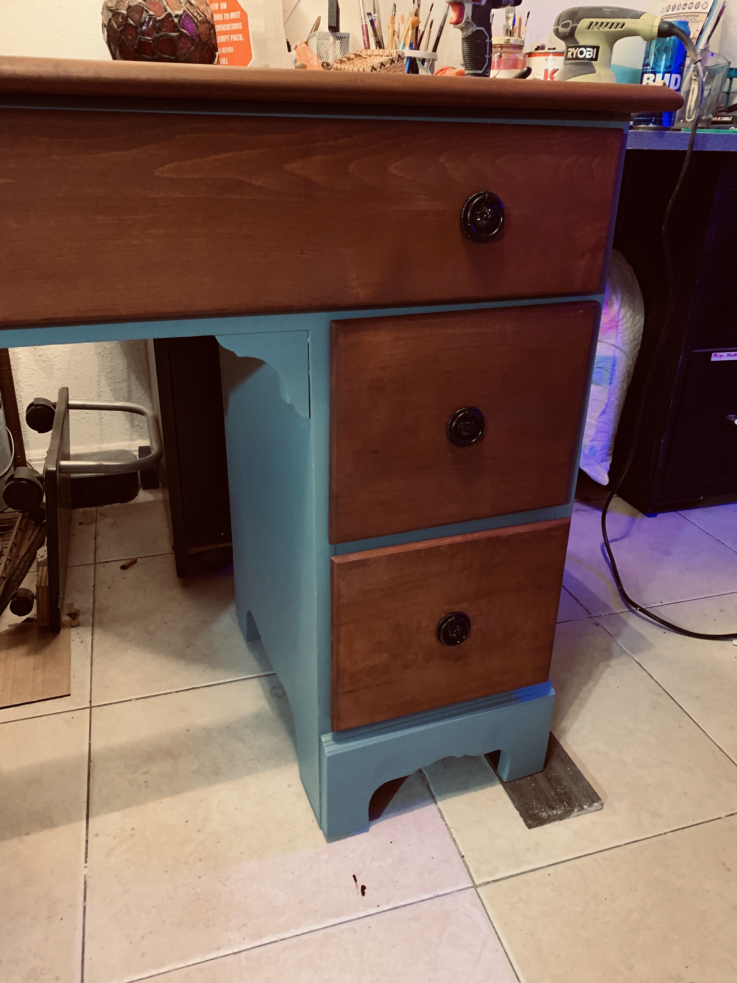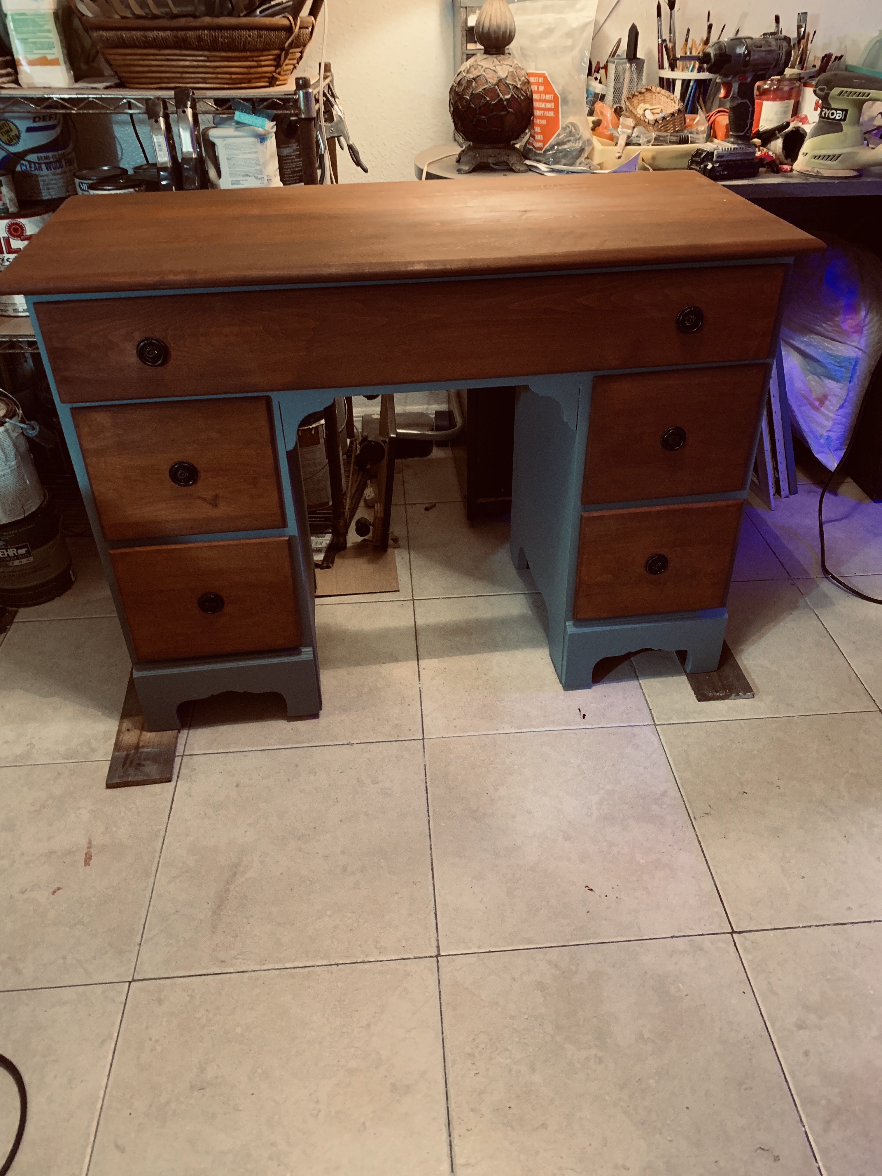 Description Vintage Burns Case Furniture Desk/Vanity. Freshly painted in Duck egg Blue with stained top and drawers in Cognac. Dimensions 29.5 tall 18.5deep 42 wide Category Furniture Price asked 200 Is item sold? No Log in or register to post comments Photos